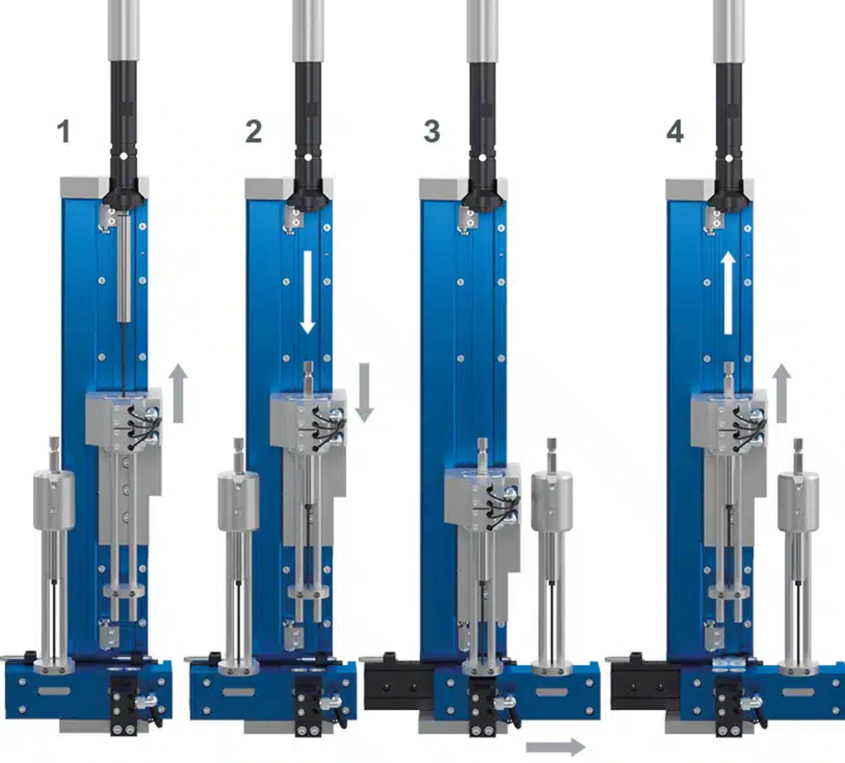 (3) Die horizontale Hubeinheit verfährt zu dem für die Verschraubung benötigten Bit, die vertikale Hubeinheit fährt nach unten, nimmt den Bithalter auf und (4) fährt nach oben. Das Bit wird automatisch oder mit Unterstützung des Roboters eingekoppelt. Der leere Bithalter wird am entsprechenden Wechselplatz abgesetzt.