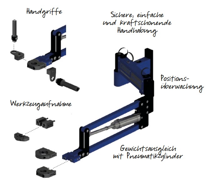 Präzises, reaktionsfreies und federleichtes Handling im gesamten Aktionsradius des Schwenkarms. Aufnahme aller Reaktionskräfte und Kompensation des Drehmoments für eine sichere, einfache und kraftschonende Montage.