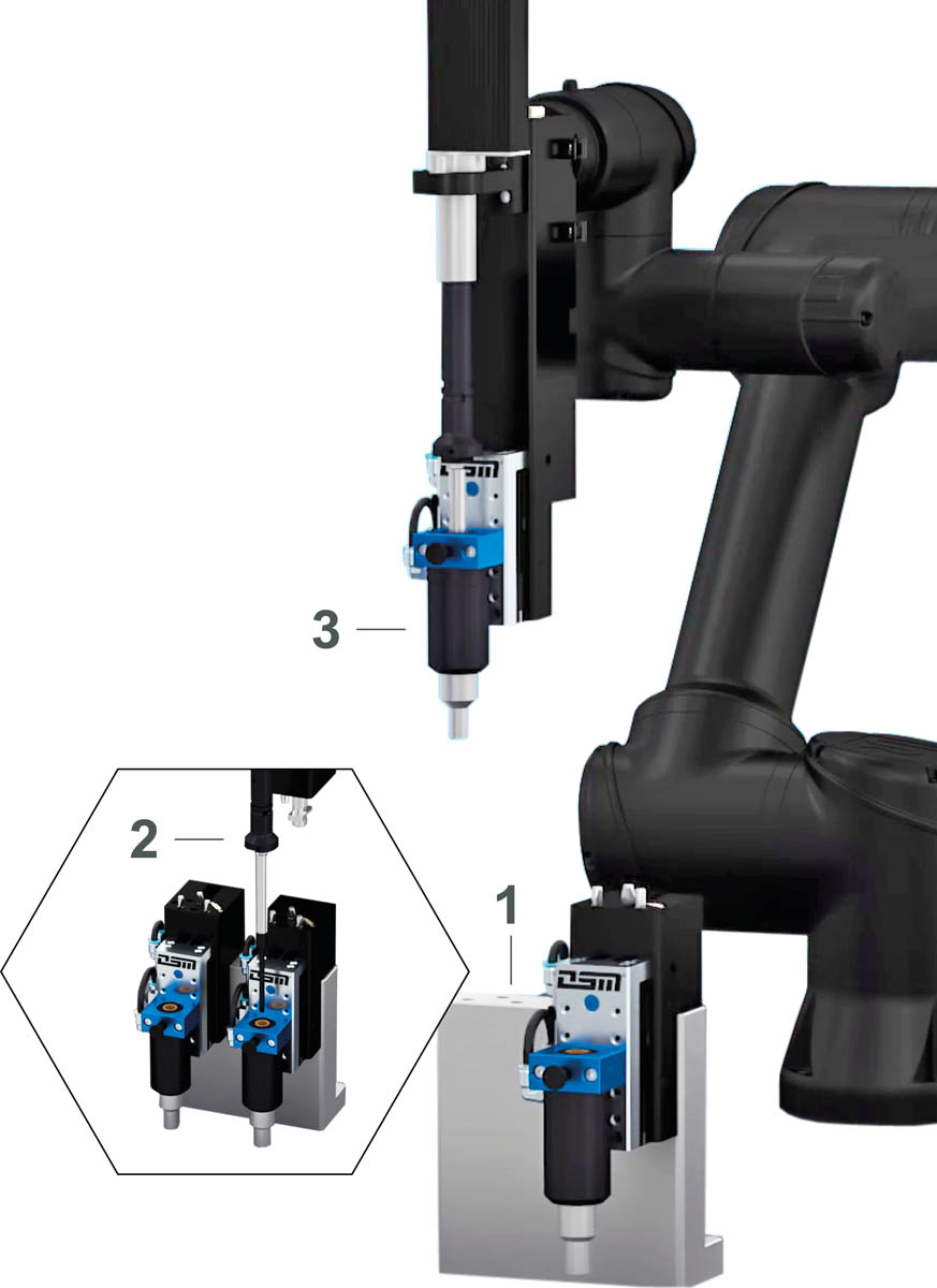 Die Schraubensetzeinheit SEL ist modular aufgebaut – sie besteht aus dem SEL-Basismodul mit einem DS-Schrauber, das am Roboter adaptiert wird und dem SEL-Koppelmodul mit Vakuum-Mundstück. Die Koppelmodule, ausgelegt für unterschiedliche Schraubengeometrien, sind werkzeuglos tauschbar und werden am Basismodul angekoppelt und pneumatisch verriegelt.
